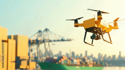 drone, shipping, container, port, harbor, logistic, technology, transport, aerial, delivery, industrial, skyline, cargo, movement, innovation, machine, navigation, freight, work, economy, activity, scene, architecture, urban, future, operation, equipment, blue skies, city landscape, travel, modern, environment, marin, sea, offshore, industry, yellow