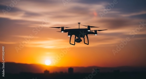 Drone silhouette against a vibrant sunset sky, capturing aerial photography.
