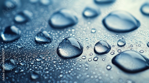 Droplets metal hydrophobic coating water beads brushed metallic surface angle view perfect spherical formation dry substrate precise lighting macro detail sharpness