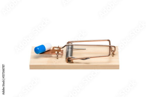 mousetrap, capsule, drug, addiction, trap, isolated, prescription, medicine, pill, concept, danger, temptation, tablet, narcotic, pharmaceutical, medication, antibiotic, risk, desire, disease, pain, painkiller, health care, health, care, unhealthy, lifestyle, idea, mouse, medicals, blue, white, background, macro, closeup, closeup, object, white background
