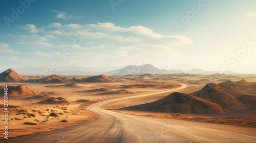 dune, twisting, road, illustration, desert, landscape, sand, horizon, isolation, immensity, beauty, winding, path, towering, endless, stark, scenery, journey, solitude, adventure, exploration, nature, barren, arid, remote, expanse, curve, serpentine, vista, calmness, emptiness