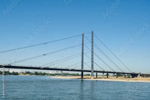 Dusseldorf, Germany – July 24, 2019: The Rheinkniebrücke is a cable-stayed bridge over the Rhine in Düsseldorf, opened to traffic on 16 October 1969.