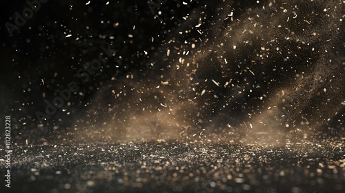 Dust and wood chips on a black background Dirt particles fly in the air Layout for design Some dust particles are blurred to transmit the effect of motion : Generative AI