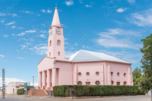 2015, africa, bell tower, karoo, south africa, summer, african, belfry, christian, church, city landscape, clock, clock-tower, pink, religion, church steeple, church steeple, street scene, sunlight, sunny, town, village