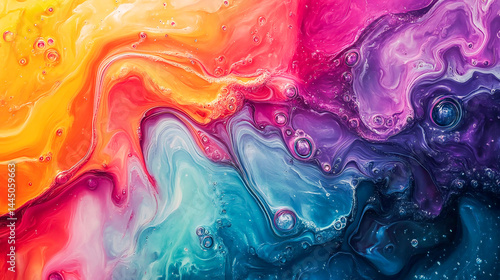 Dynamic abstract image of vivid paint splashes colliding midair creating a mesmerizing swirl of colors resembling a chemical reaction or cosmic event