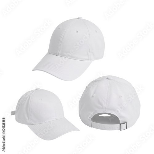 Dynamic arrangement showcasing three plain white baseball caps against a transparent scene