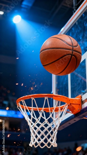 basketball, hoop, sport, game, competition, excitement, dynamic, action, motion, movement, energy, thrill, spotlight, stadium, arena, crowd, cheering, fast, speed, athletic, skill, slam, dunk, net, orange, white, blue, dramatic, intense, thrilling, professional, sportsmanship, teamwork, electrifying, flying, spark