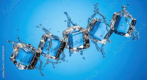 Dynamic Ice Cubes and Water Splashes on Blue Background, Liquid, Cold, Refreshing