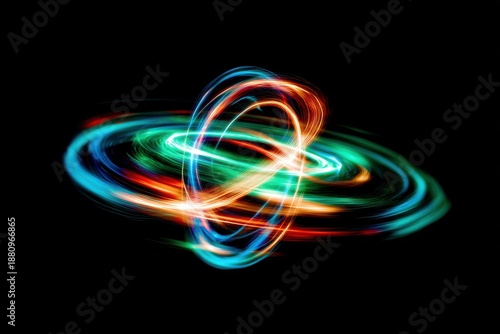Dynamic light trails forming abstract energy rings on black background, ideal for technology marketing, science visuals, innovation campaigns or futuristic digital backgrounds