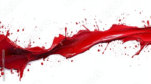 Dynamic red liquid splash against white backdrop; vibrant, flowing stream with scattered droplets