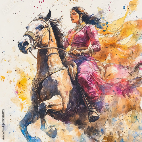 Dynamic Watercolor Illustration of a Brave Warrior Woman on Horseback, Showcasing Strength, Courage, and Historical Inspiration