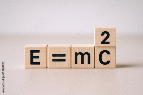 E equals MC squared concept on wooden blocks, illustrating physics theory and scientific equation