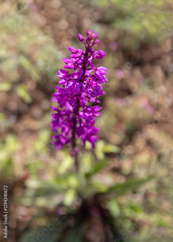 Early spring purple flower Orchis purpurea, mascula, Ophrys arachnitiformis, Orchis simia, in the forest, green blurry background