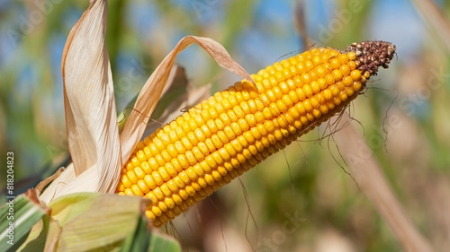 ears of corn and green leaves on a field background close-up. farm, A selective focus picture of corn cob in organic corn field. concept of good harvest, agricultural, yellow corn kernels