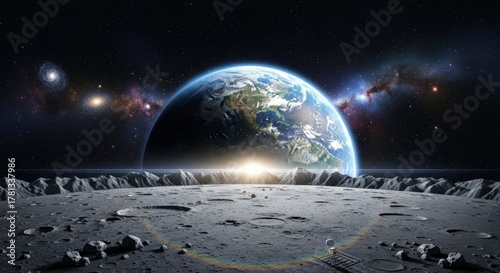 earth, moon, space, planet, galaxy, star, nebula, cosmos, universe, astronomy, celestial, orbit, lunar, surface, crater, rocky, landscape, view, perspective, glowing, bright, blue, green, atmosphere, light, sun, sunrise, horizon, darkness, black, deep, huge, infinite, exploration, discovery, science, future, technology, mission, astronaut, dream, wonder, beauty, majestic, epic, dramatic, cinematic, digital, art