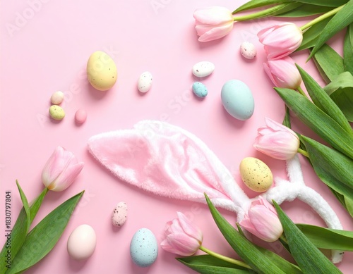 easter, tulip, egg, pink, rabbit, ear, pastel, spring, floral, celebration, festive, holiday, decoration, arrangement, still, life, colourful, speckled, soft, light, delicate, blossom, bloom, green, leaf, flower petals, whimsical, cute, adorable, sweet, joyous, cheerful, vibrant, seasonal, occasion, springtime, nature, flora, background, overhead, composition, elegant, decorative, bright, fresh, beautiful