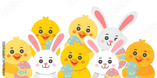 easter, rabbit, chick, egg, spring, holiday, season, celebration, animal, rabbit, chicken, cute, cartoon, illustration, character, design, isolated, white background, graphic, simple, flat, cheerful, festive, joyful, sweet, adorable, smiling, group, set, banner, header, horizontal, peeking, looking, textured, pastel, blue, pink, yellow, green, decoration, symbol, tradition, event, children, childhood, fun, happy