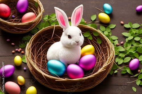 Easter bunny and colorful eggs in a basket on green grass.