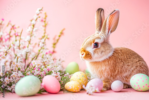 Easter Bunny with Colorful Eggs and Spring Flowers