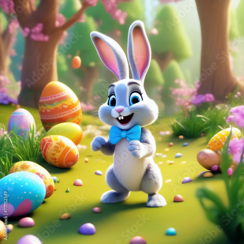 Easter. Easter bunny in 3D with chocolate eggs on a colorful background. Playful image created by AI.