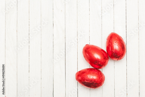 easter egg, red, topview, up high, tinfoil, wrapped, shiny, chocolate, easter, egg, food, shape, wooden, wood, white, bright, pattern, striped, row, gift, purity, nobody, rustic, group, table, background, copy space
