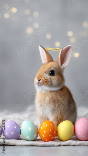 easter, festival, rabbit, rabbit, egg, pastel, spring, halo, bokeh, holiday, young, animal, mammal, pet, fur, whisker, ear, portrait, closeup, studio, lighting, soft, grey, background, sparkle, blur, decoration, celebration, painted, colourful, gold, ring, angel, peaceful, fabric, clothes, textile, table, arrangement, springtime, vertical, minimal, greeting, card, copy