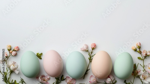 Easter party concept. Top view photo of easter bunny ears white pink blue and yellow eggs on isolated pastel blue background with copyspace in the middle