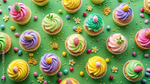 Easter Spring Cupcakes Bird's Eye View: Delicious Sprinkled Treats on Green Background