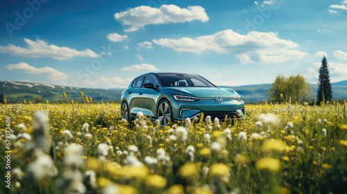 Eco friendly car development, clear ecology driving; no pollution and emmission transportation concept. green car icon on fresh spring