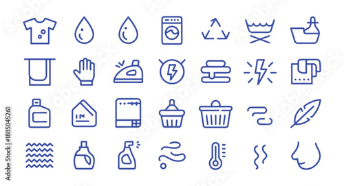 laundry, icon, set, line art, blue, white background, sustainable, washing, cleaning, recycling, energy efficiency, t-shirt, soap, detergent, eco, green, environmentally friendly, laundry basket, washing machine, dryer, minimalistic, simple, illustration, vector, graphic design, isolated, household, chore, temperature, thermometer, leaf, feather, wave, zigzag