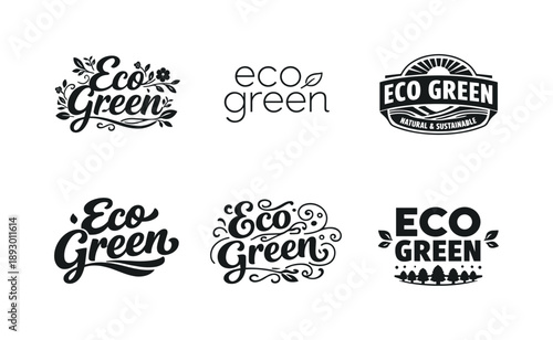eco, typography, variation, green, set, lettering, harmonious, same, emblematic, concept, each, different, artistic