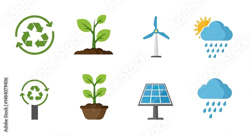 Eco-friendly icons representing sustainability, nature, and renewable energy sources