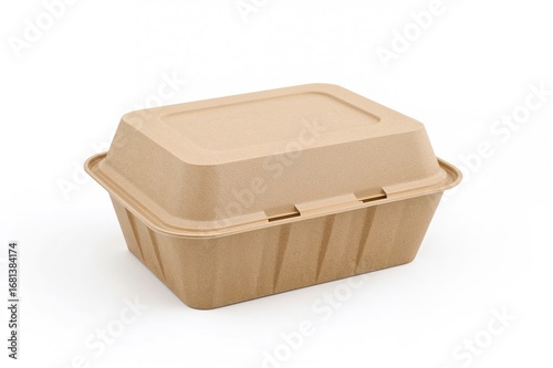 Eco-friendly molded pulp clamshell container with a hinged lid for holding food, biodegradable and sustainable design, shown on a white background
