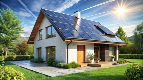 Ecological house with solar panels, rendering, ecological, house