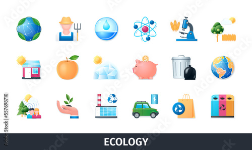 Ecology 3d vector icon set. Eco, environment, water, bio, trash, recycling plant, earth, solar energy. Realistic objects in 3D style
