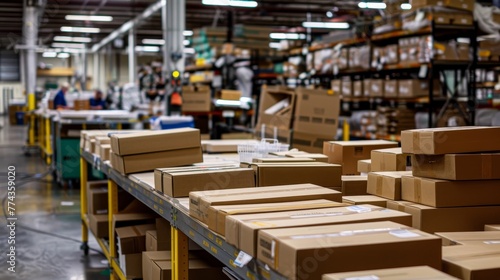 industry, factory, warehouse, shipping, working, box, container, cardboard box, indoor, manufacturing, pallet, occupation, equipment, business, store, cardboard, assembly line, storage room, crate, large, delivering, shelf, technology, packing, stack, package, conveyer belt, in a row, workshop, transportation, no people, industrial building, merchandise, metal, cardbox, work tool, sending, order, steel, robot