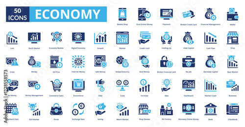Economy fill icon collection set. Includes efficiency, money, saving, scheme, finance, system, conservation, control, elegance, action, budget