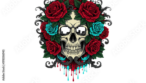 Edgy Skull with Red and Teal Roses and Gothic Vines for Alternative Fashion, Tattoo Art, and Halloween Design