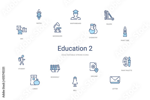 education 2 concept 14 colorful outline icons. 2 color blue stroke icons