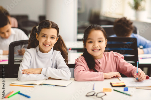 Education And Children Concept. Portrait of happy smiling small girls sitting at desk in classroom at elementary school with group of classmates in background and posing, looking at camera