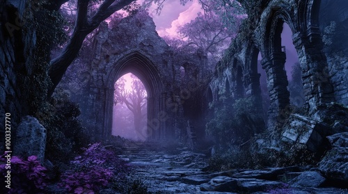 Eerie Abandoned Medieval Temple: Gothic Architecture with Nature Reclaiming, Ominous Atmosphere in Dim Lighting