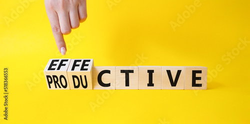 Effective and Productive symbol. Businessman Hand turns a cube and changes the word Productive to Effective. Beautiful yellow background. Business and Effective and Productive concept. Copy space