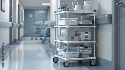 Efficient Healthcare Nurse's Cart Filled with Essential Medical Supplies in Hospital Corridor