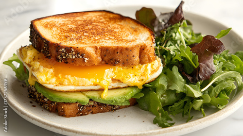 Egg and cheese sandwich with avocado and a side of mixed greens.