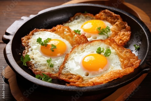 kitchen utensile, food and drink, fried food, frying pan, still life, breakfast, albumen, fast food, freshness, fried egg, vegetable, closeup, egg yolk, omelet, crispy, bacon, bread, brown, fried, photo, table, image, dish, food, meal, meat, pork meat, egg, pan, frying