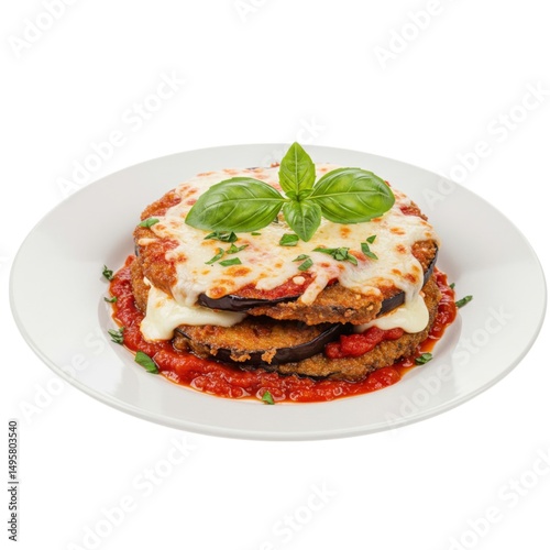 aubergine, parmigiana, dish, food, italian, cookery, meal, dinner, lunch, tomatoes, cheese, basil, sauce, plate, fried, baked, delicious, epicure, vegetarian, portion, stack, round, herb, cook, receipe, eat, fresh, healthy, tasty, white, background