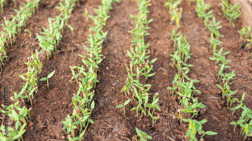 Eggplant sprouts in the soil of a greenhouse grown from seeds. Agriculture , agribusiness, environmental consumption, vegan, horticulture, organic ecological environmen, agricultural business concept