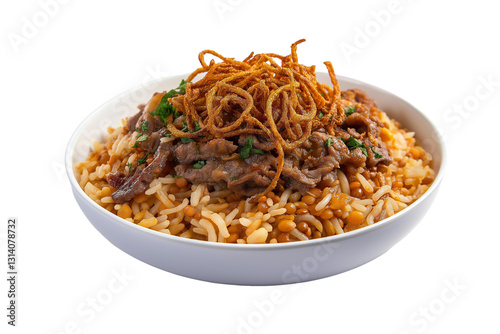 Egyptian koshari rice, lentils, pasta with crispy onions isolated on transparent white background