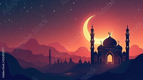 sunset, sky, night, landscape, city, silhouette, architecture, sun, mosque, illustration, sunrise, moon, star, religion, building, church, star, nature, light, mountain, dusk, cloud, temple, tower, skyline