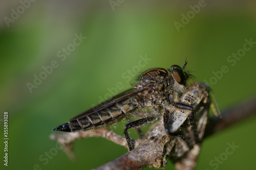 Eine lange braune Fliege mit viele Körpersegmente hält eine Motte fest und steht damit auf einem Ast. Der Hintergrund ist grün und unscharf.